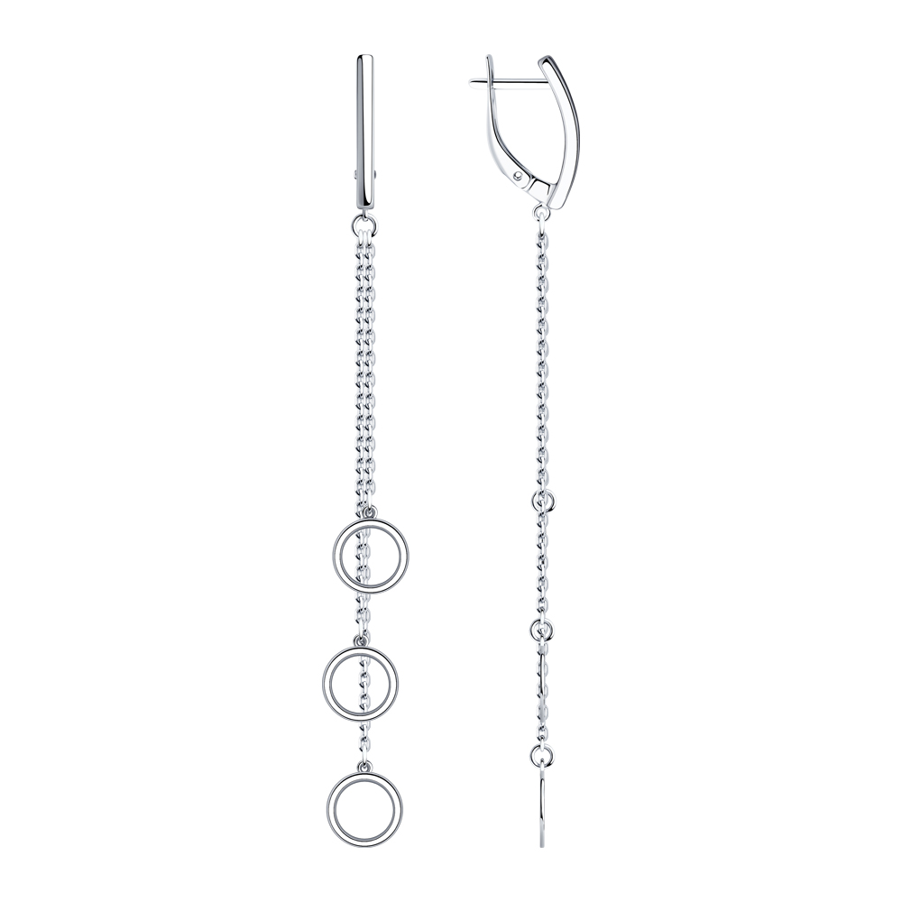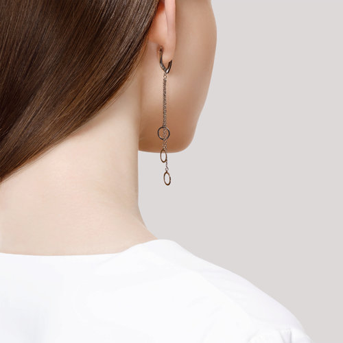 Diese Ohrringe haben eine lange, filigrane Form. An jeweils drei feinen Kettchen in unterschiedlicher Länge sind kleine Ringe angebracht. Die Ohrringe wirken dadurch auf eine feine Art verspielt, lässig und modern. Durch die rhodinierte Oberfläche glänzen sie wunderschön bei jeder Bewegung. Sie können damit beinahe jeden Look aufpeppen und ihm eine lässige Note zufügen. Ob zu Jeans, weißer Sommerbluse, oder ein schlichter Office Look – diese Silberohrringe passen zu Allem und jeder Jahreszeit. Daher eignen sie sich auch perfekt als Geschenk und können von Frauen in jedem Alter getragen werden.